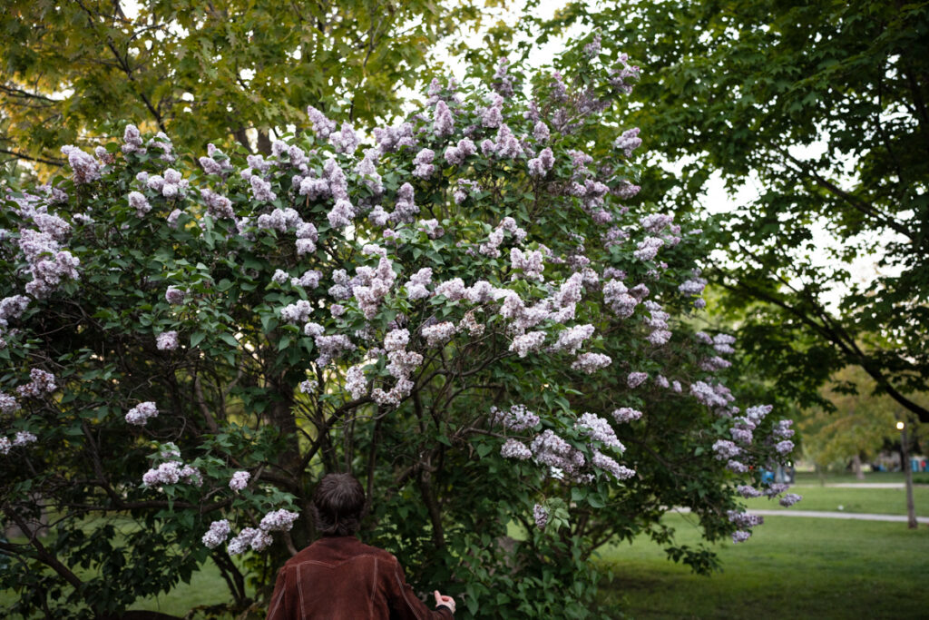 We finish a lovely dinner at Milou and start walking. Sophie says she’ll walk me down to Queen & Ossington—then turn around to head home. It’s nice out though —and instead we turn left and walk into Trinity Bellwoods Park. I took a couple of pictures along the way. Entering the park I see a giant lilac bush and I can imagine an impromptu fashion shoot; a set of pictures. I start asking about fashion as I shoot. Sophie is a natural at being a natural; at being Sophie. The pics come easy.